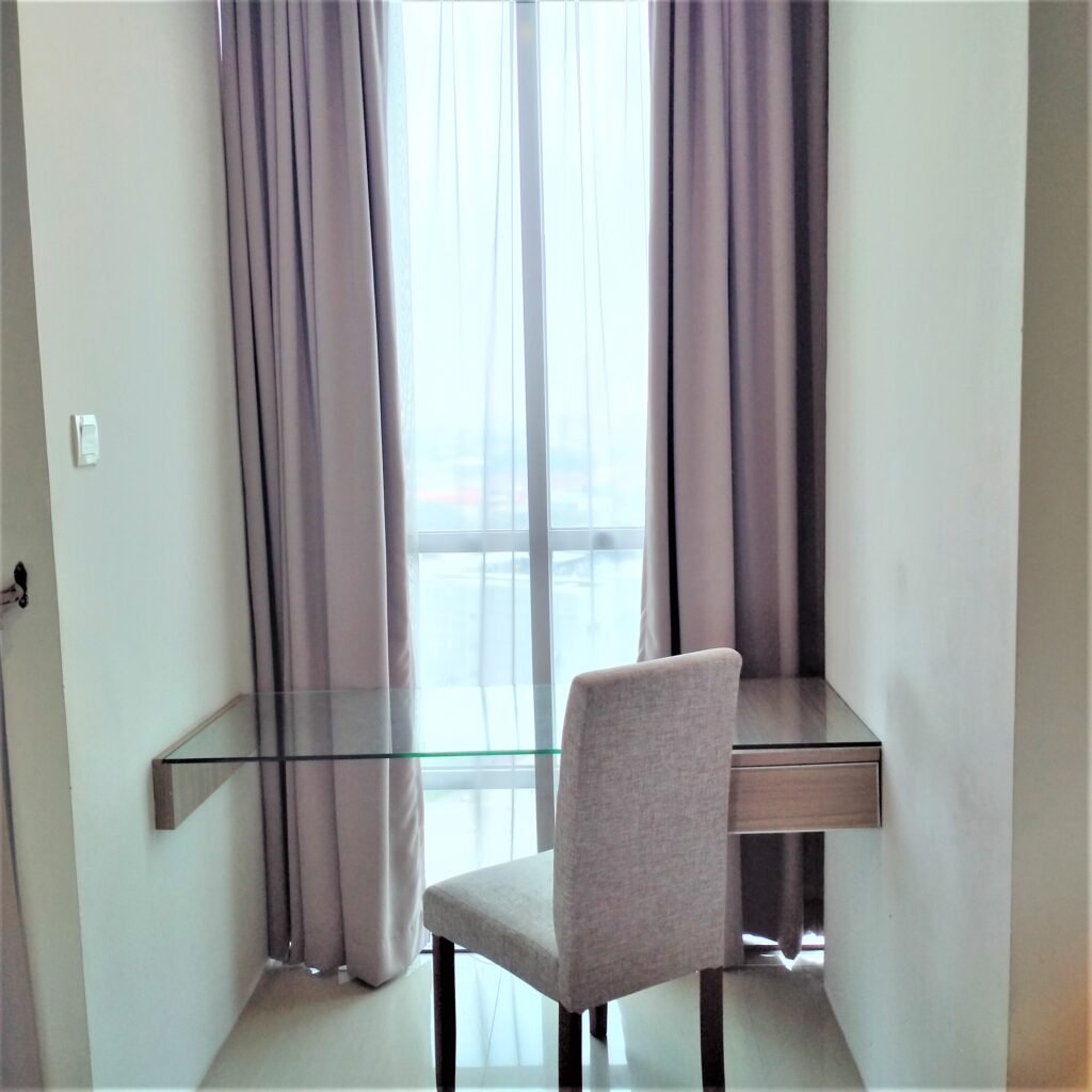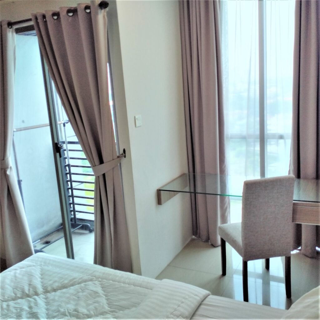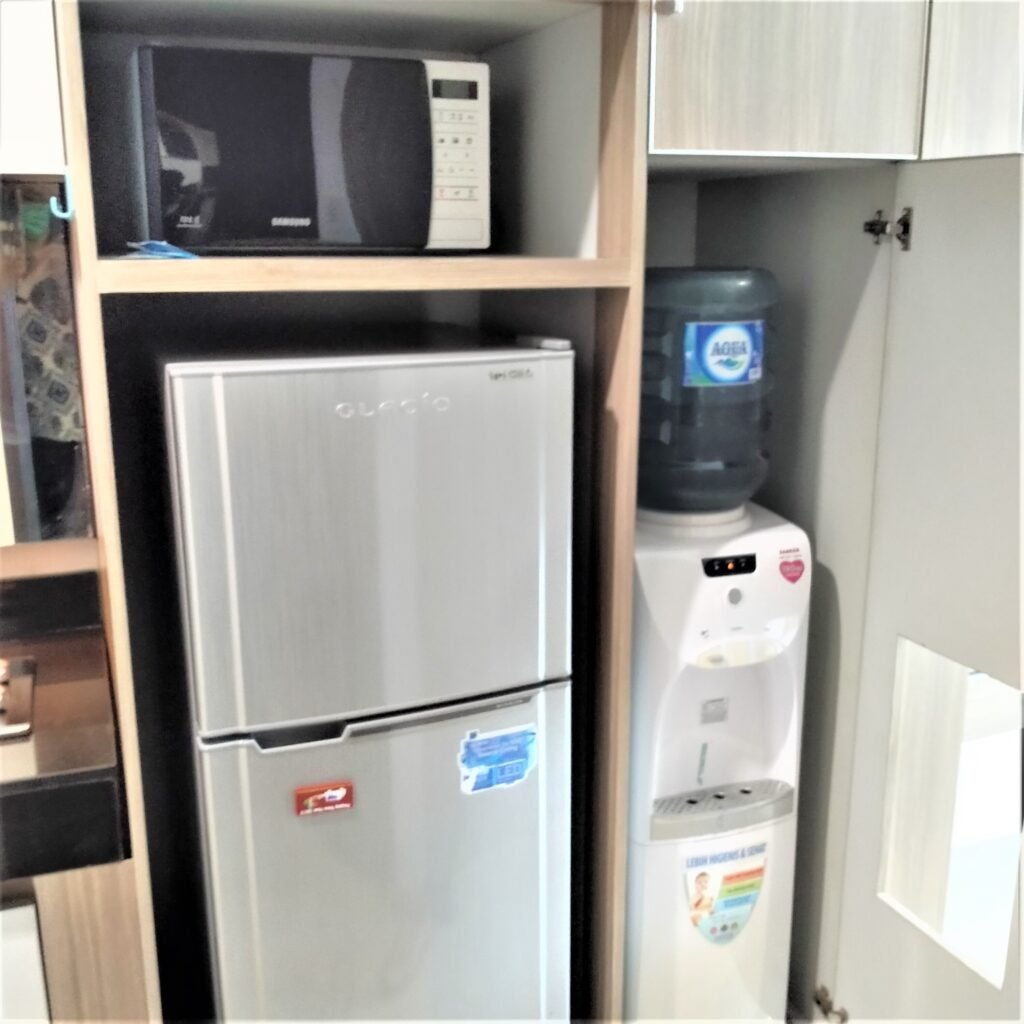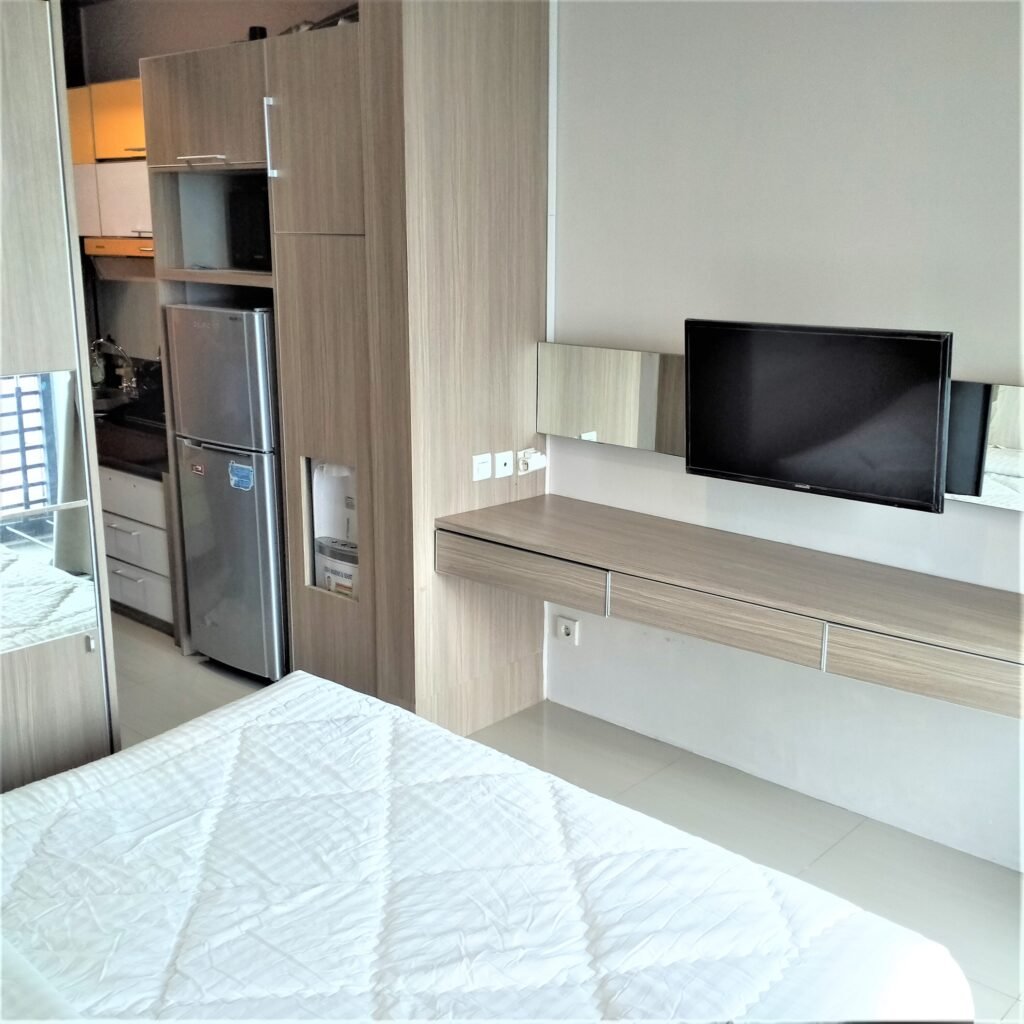 Kamar tidur yang nyaman di desain minimalis sederhana lengkap dengan furnitur, kamar mandi yang bersih, dan juga dapur yang bersih lengkap dengan furnitur. Ada TV, AC, Kulkas, Water Dispenser, Microwave