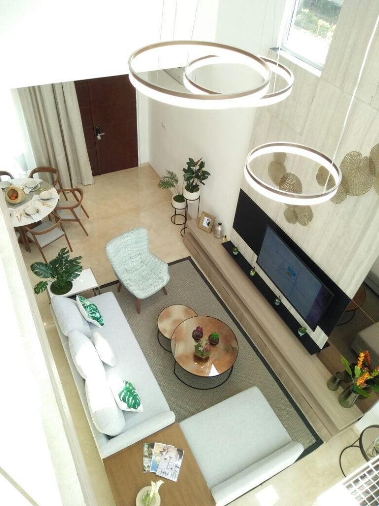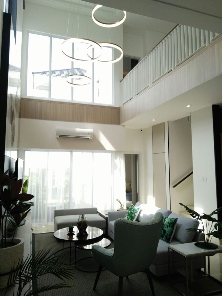 -tinggi ceiling 7 meter, double volume pada living room.
